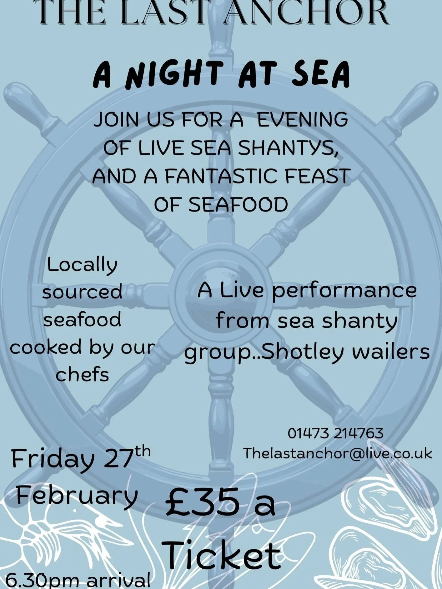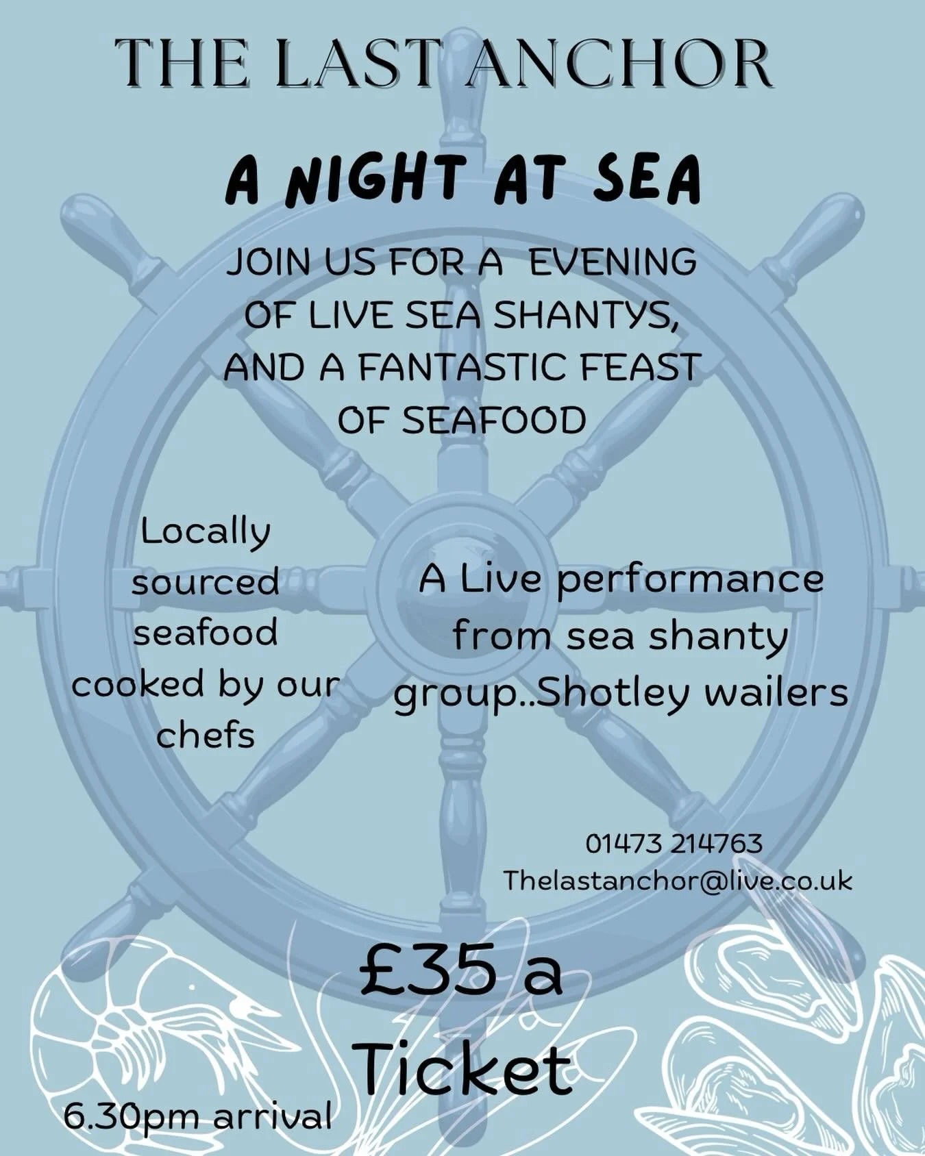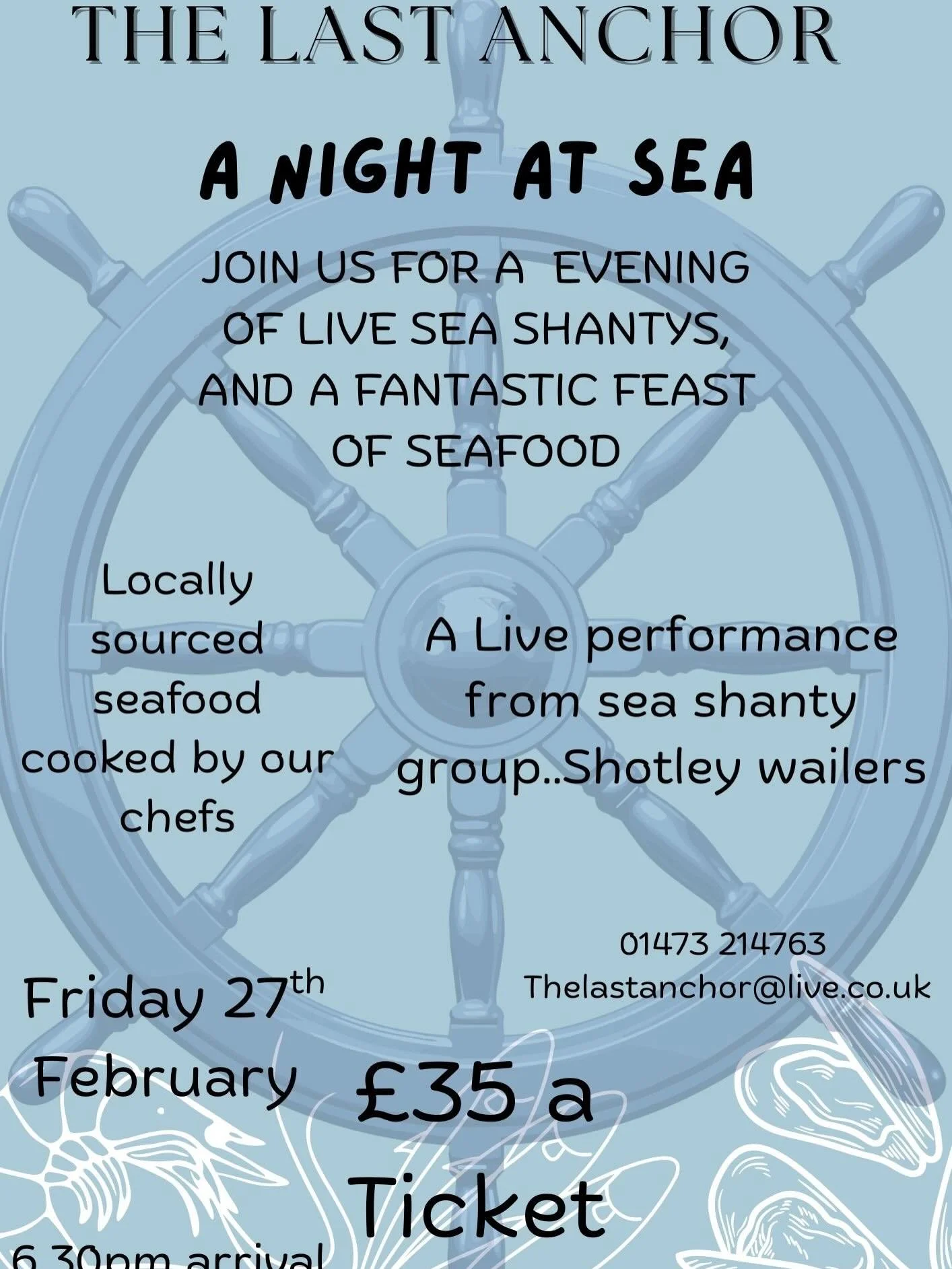 Book for a table for our Sea themed evening, with a selection of great seafood, and live sea shanty performers it’s going to be a great night!