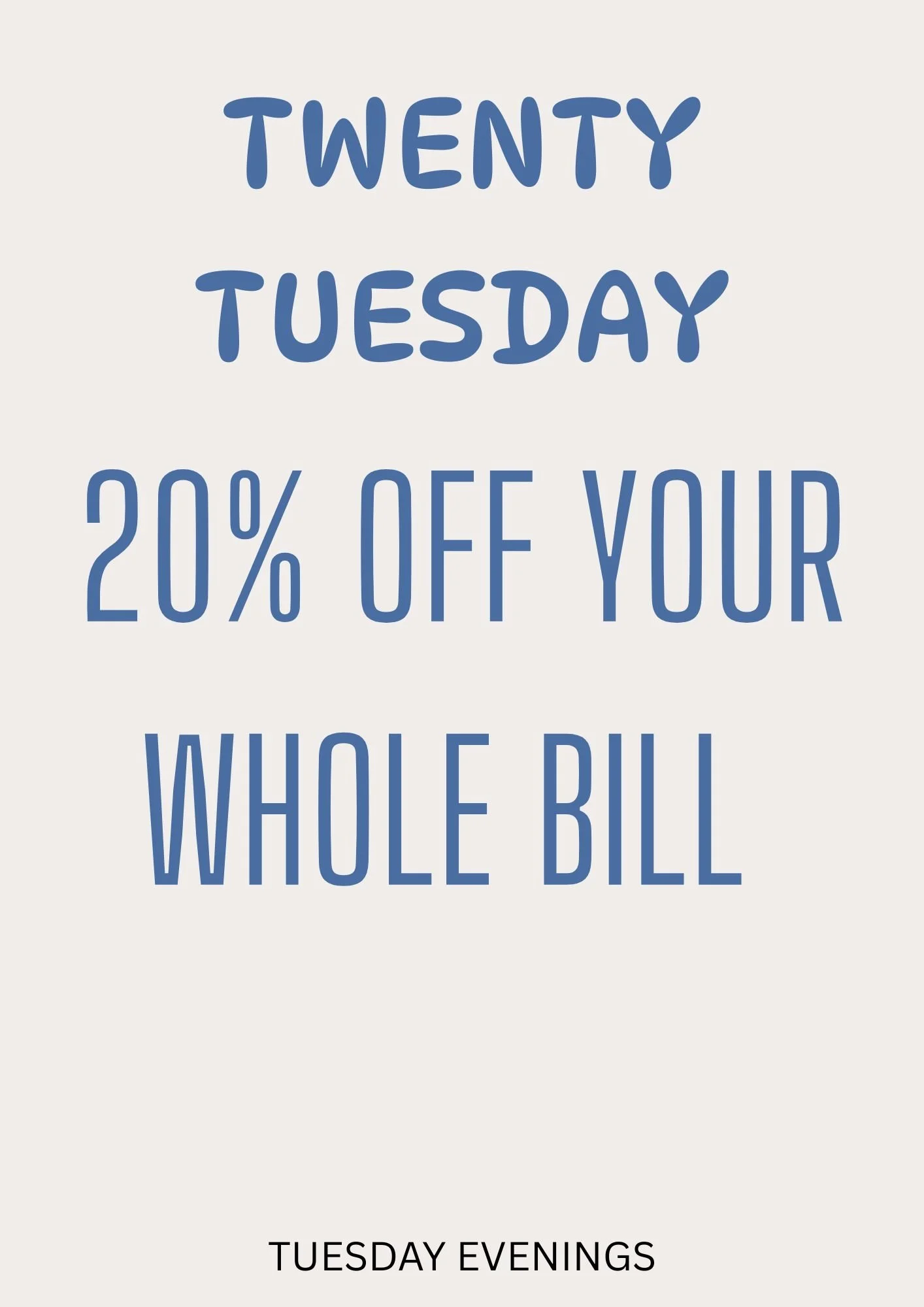 Get twenty percent of your whole bill Tuesday Evenings!