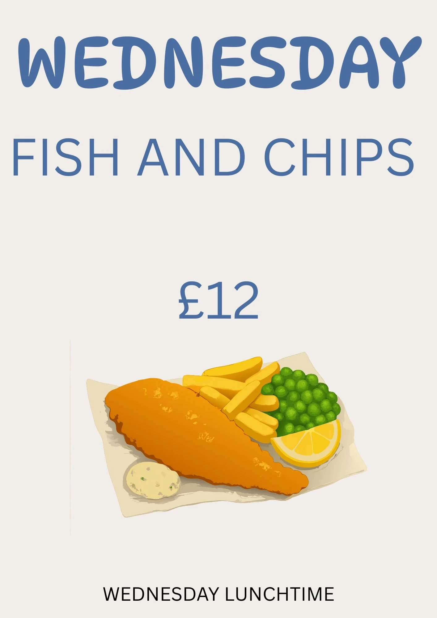 Enjoy our fish and chips, homemade mushy peas and homemade tartare sauce for just £12 Wednesday lunch times